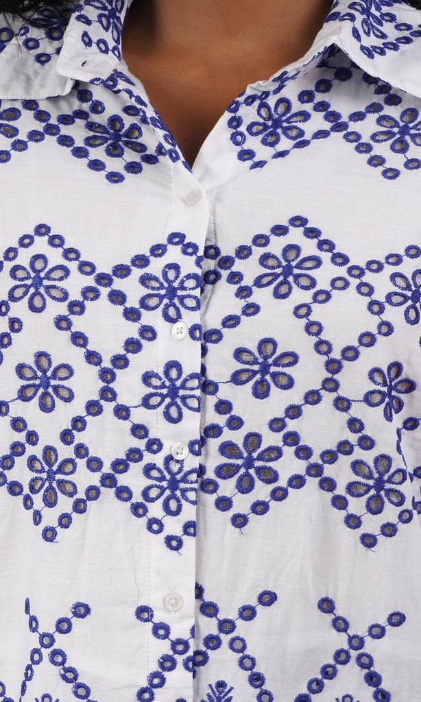 It’s all things fun showcasing motifs of geometric eyelet embroidery throughout the piece with scalloping done over the edges.