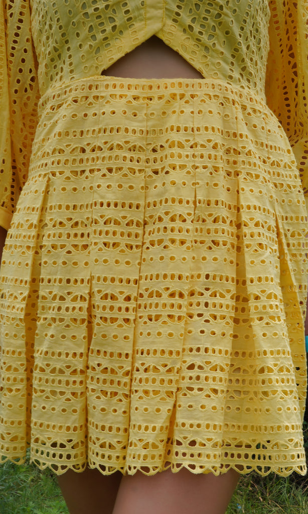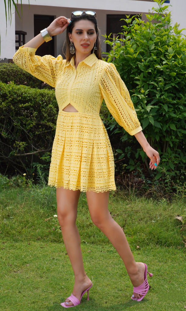 The Yellow Emma Dress is covered in schiffli with a cut out for a glamorous look. With button up and collared neck, pleated bottom and fit at the waist, this dress is flattering for all your get togethers.