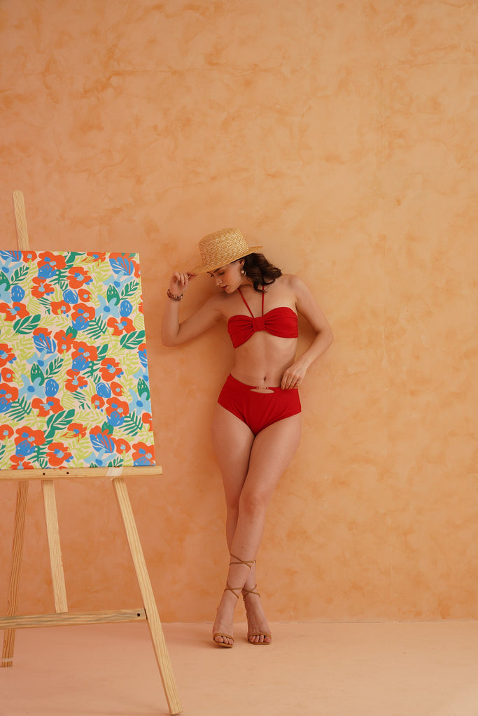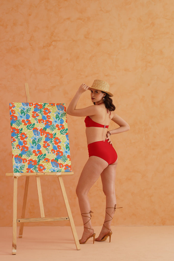 Attractive 2 piece bikini set in bright red print with robe.