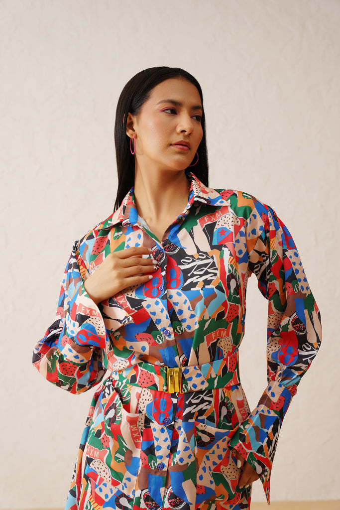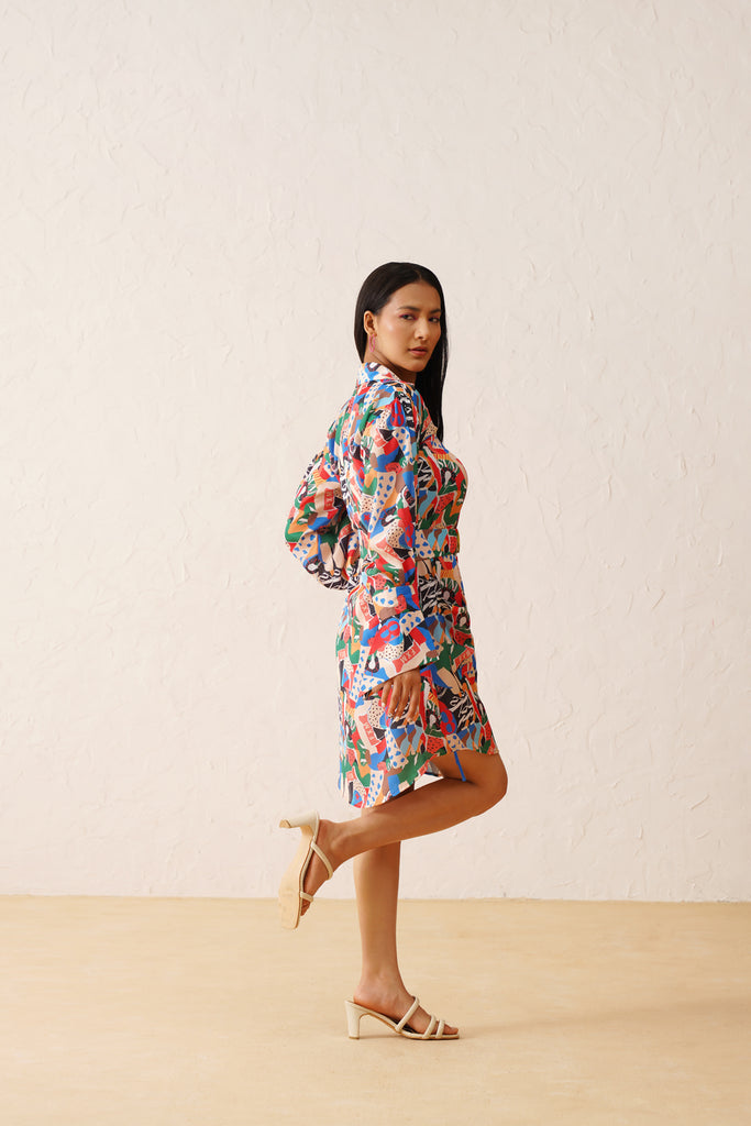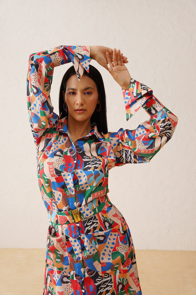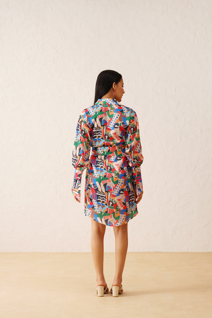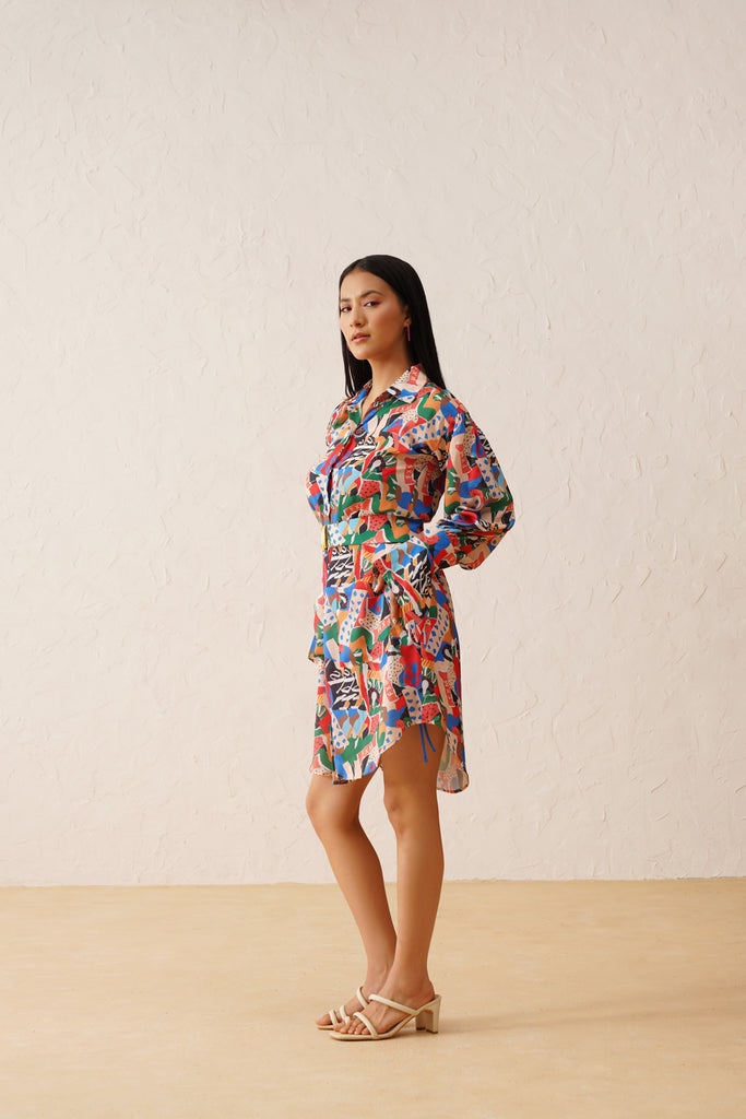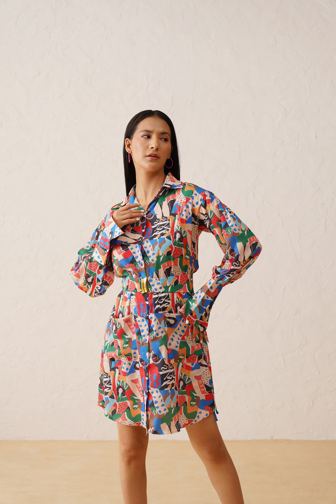 Cleo Shirt Dress, featuring puffed sleeved and a tie-up style belt for shaping the silhouette. Wear it over a swimsuit or over a pair of shorts, the look works as a resort separate as well as a full outfit on its own